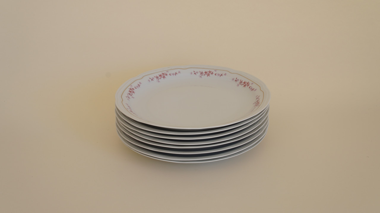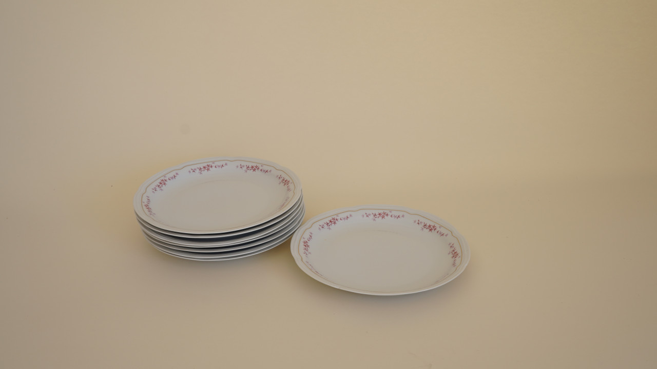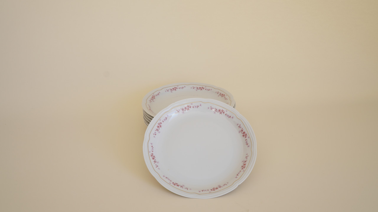 • A set of vintage-inspired white porcelain plates with scalloped edges and a delicate red floral rim pattern. Perfect for period settings, rustic table styling, or adding a touch of timeless elegance to food photography and film productions.