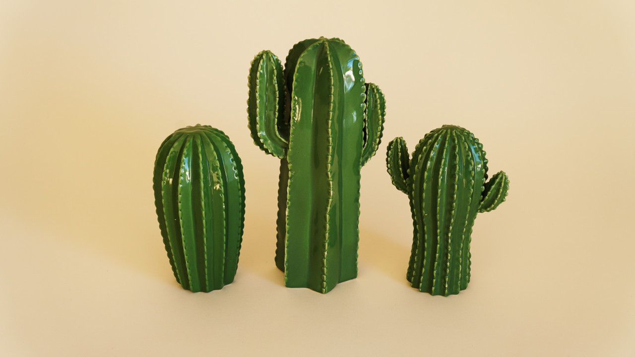 • Set of three small ceramic green cacti. Ideal to decorate tables and furniture.