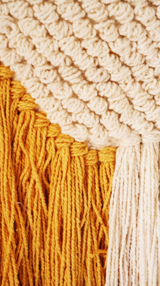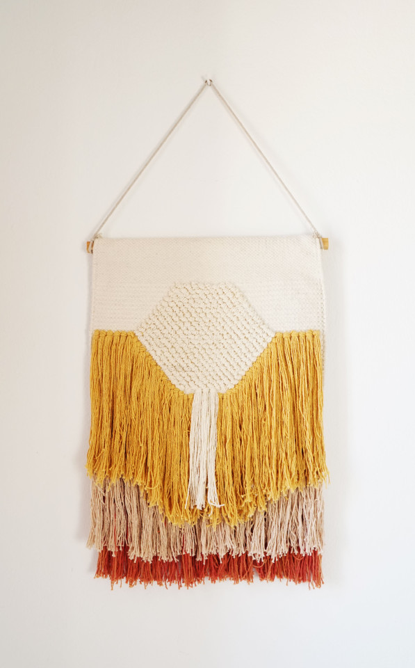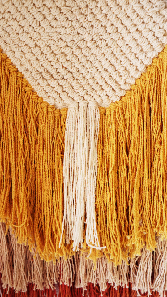 • Wall decoration with earth tones and round geometric patterns. Made of coarse threaded fabric macrame style.